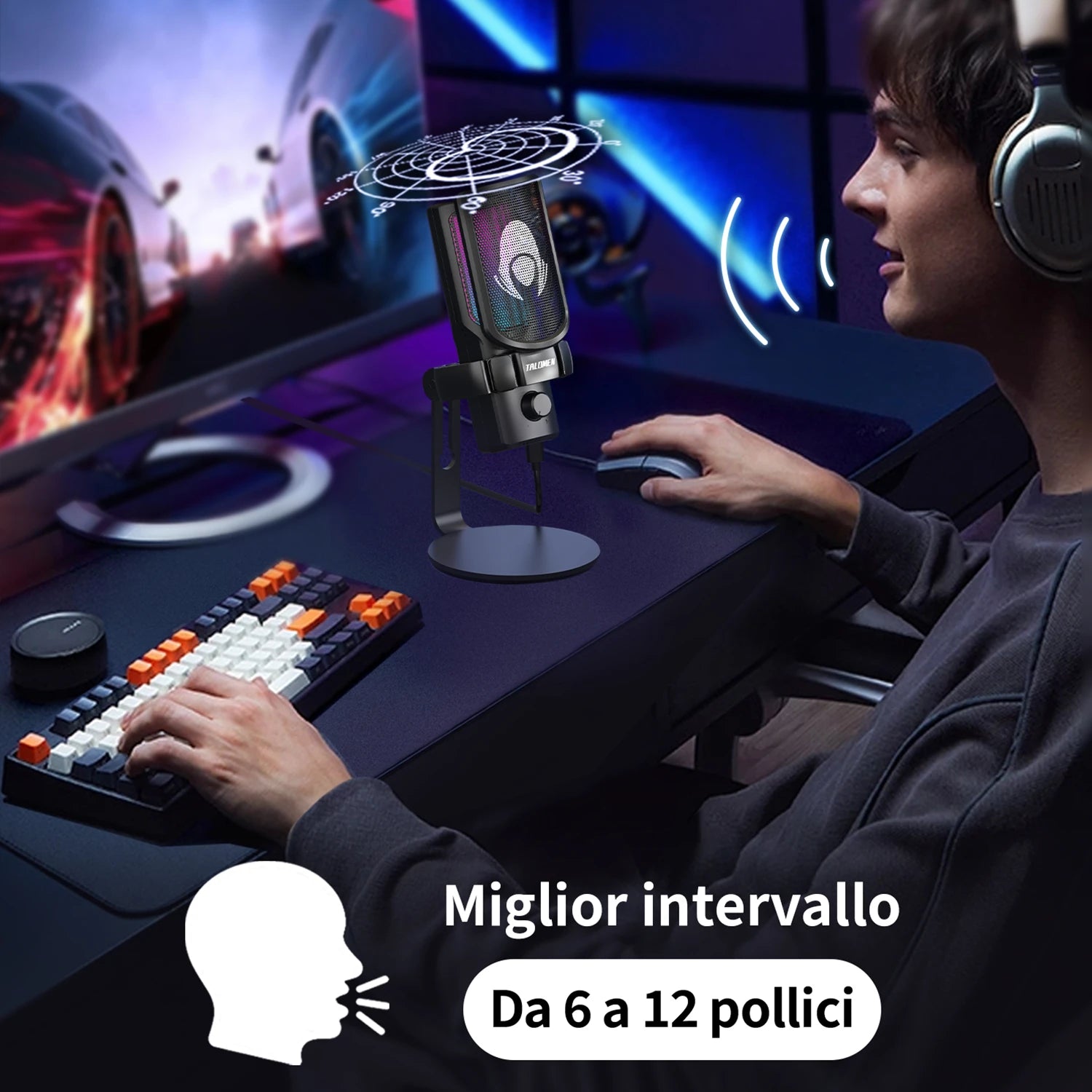 Il microfono Talomen Eyas è un microfono in streaming progettato specificamente per i giocatori su PC con un modello cardioide che si concentra sulla sorgente sonora principale, catturando la tua voce anche in ambienti rumorosi in modo da poter comunicare accuratamente con i tuoi partner di gioco.