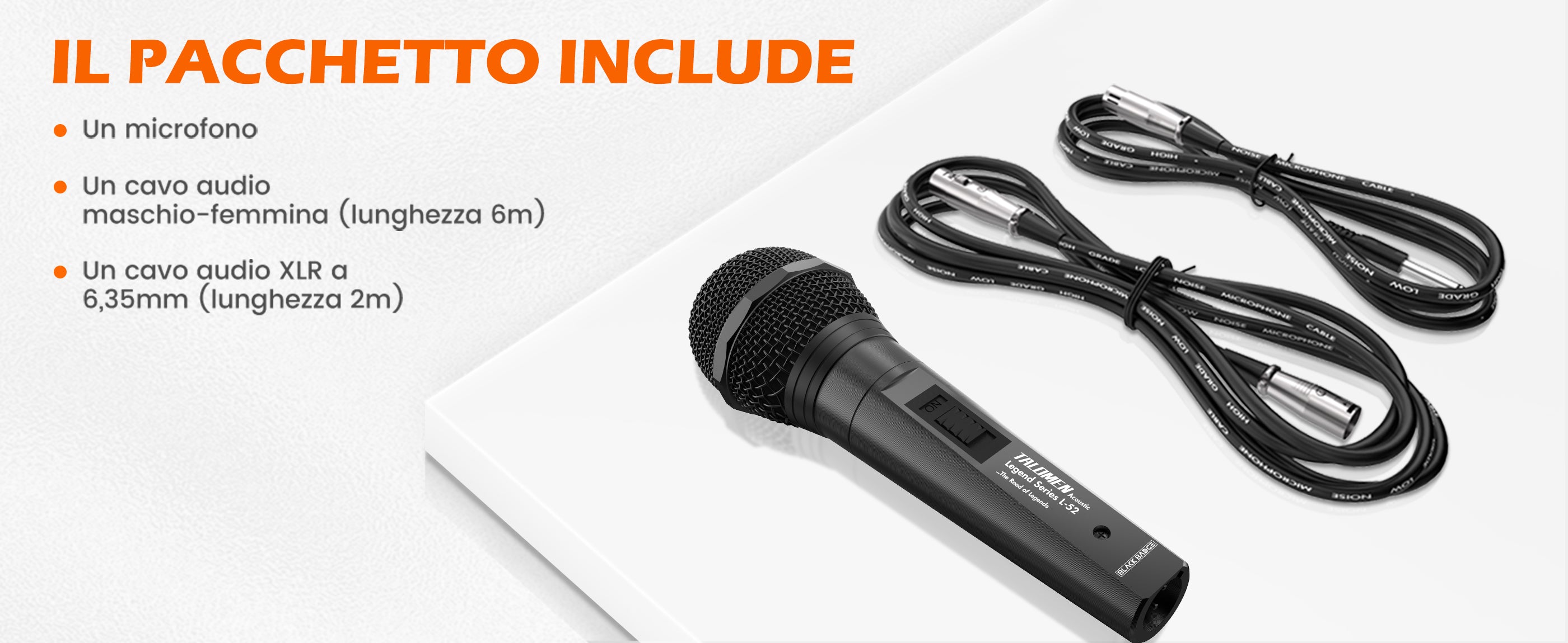Il Talomen L52 è un microfono dinamico supercardioide dotato di due cavi audio ed è compatibile con tutti i microfoni con ingressi da 6,35 mm e ingressi XLR. La versione Black Badge è rifinita in metallo nero opaco.