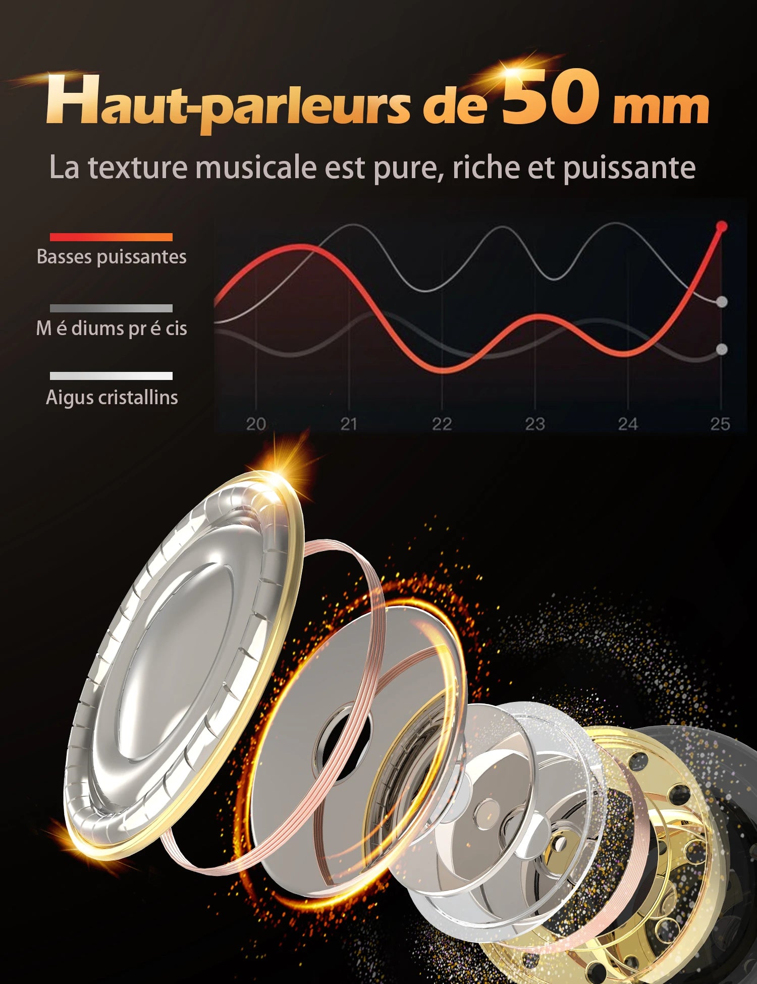 Fabriqués avec des panneaux en aluminium personnalisés et des composants métalliques clés, ces écouteurs DJ professionnels offrent un son raffiné et un confort qui résistent aux rigueurs d'une utilisation professionnelle. La conception pliable et les câbles détachables les rendent idéaux pour une écoute en déplacement, tandis que la structure renforcée garantit des performances durables.