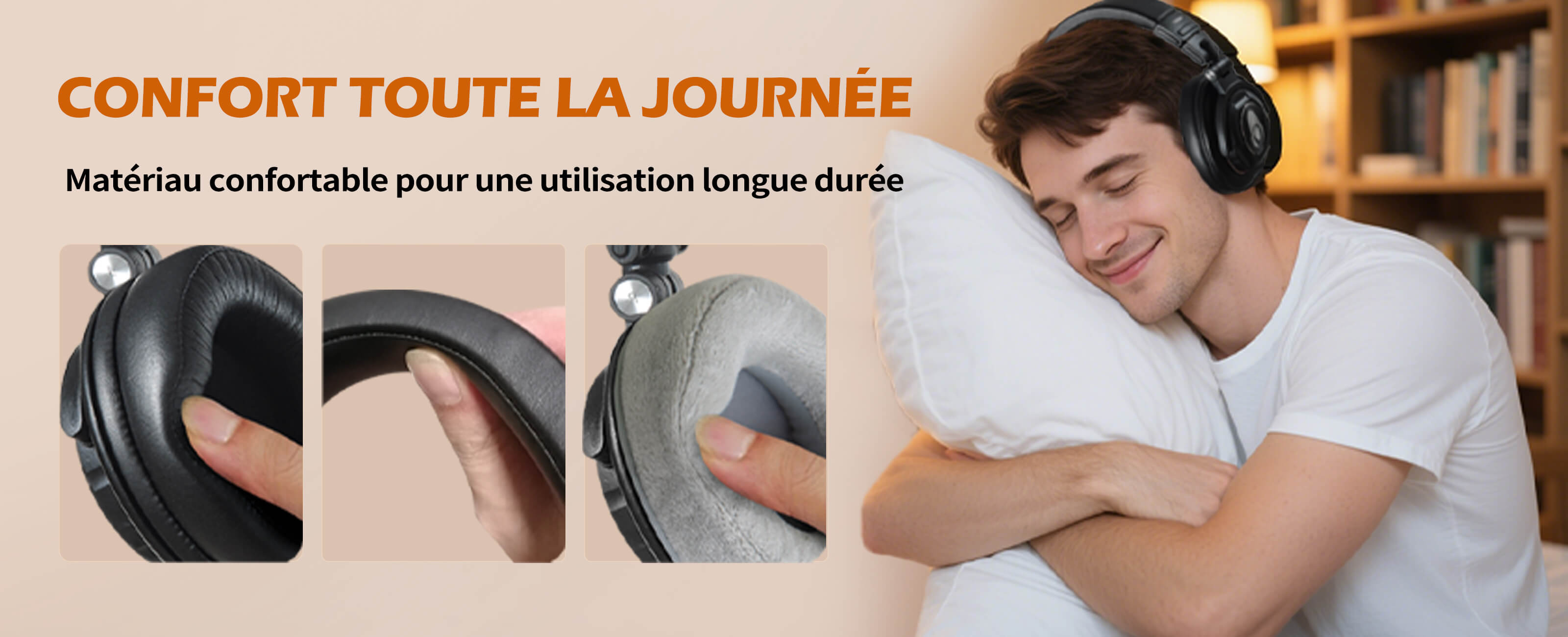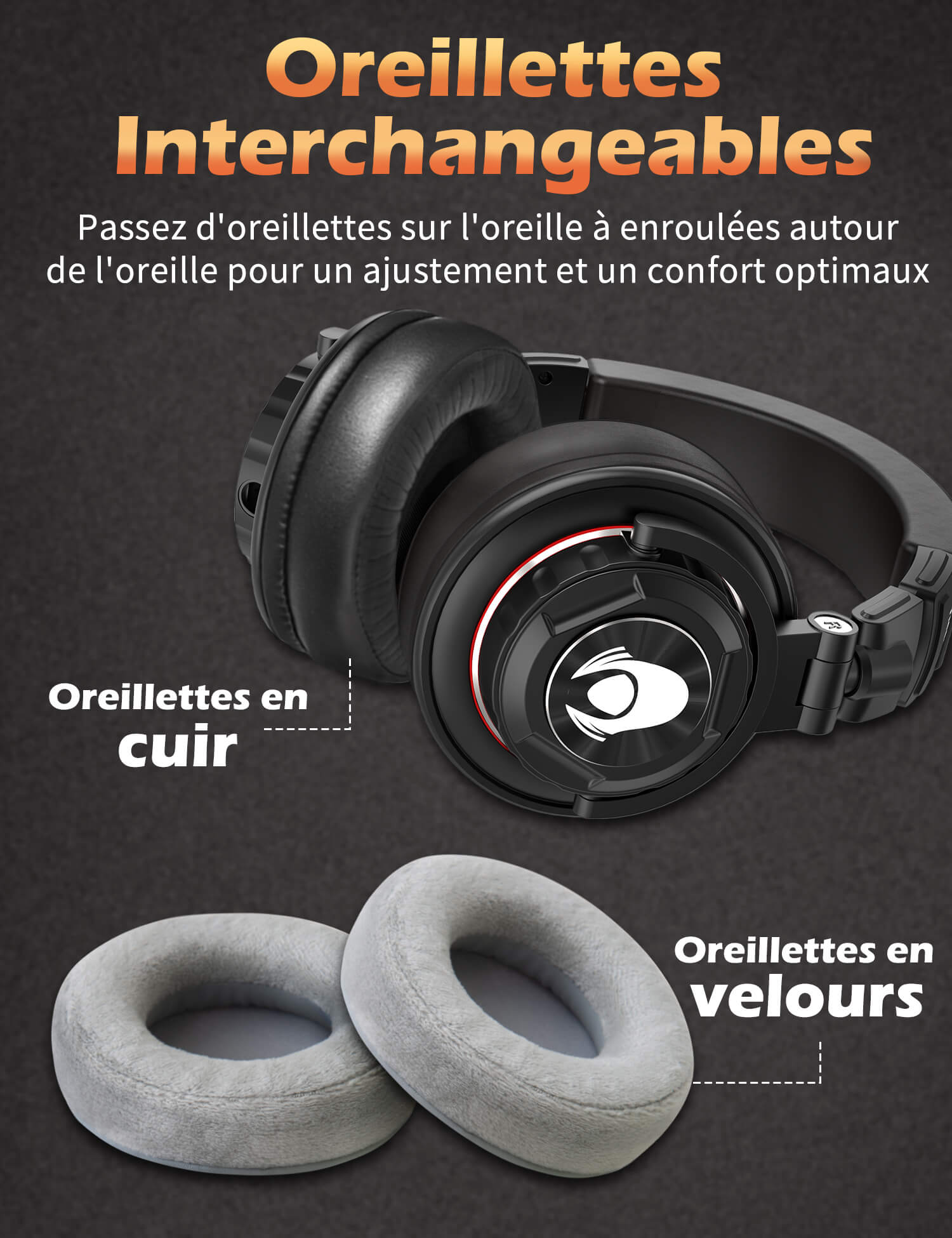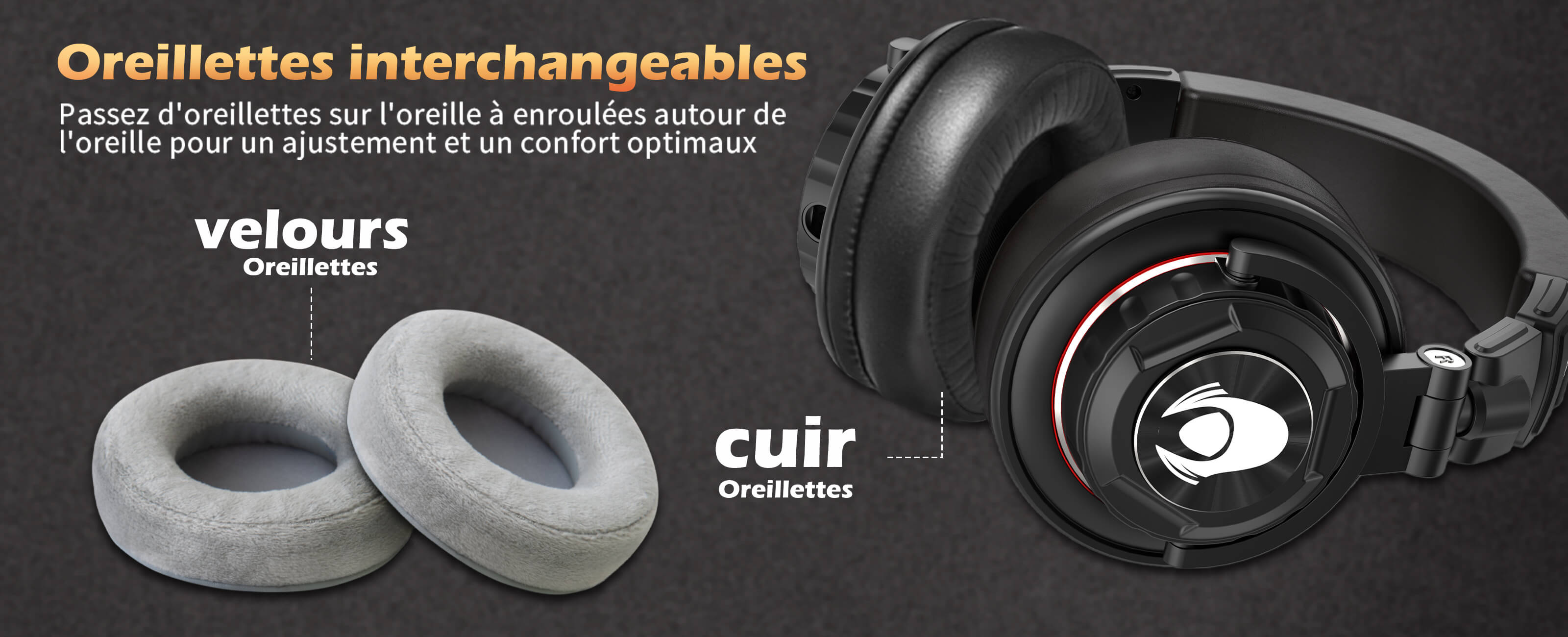 Cache-oreilles en cuir et velours : Les cache-oreilles en cuir sont délicats au toucher, s'ajustent parfaitement et offrent une sensation enveloppante et une excellente isolation phonique. Les cache-oreilles en velours remplaçables sont doux et respirants, aussi légers qu'un nuage, avec une surface en velours fin et agréable au toucher.